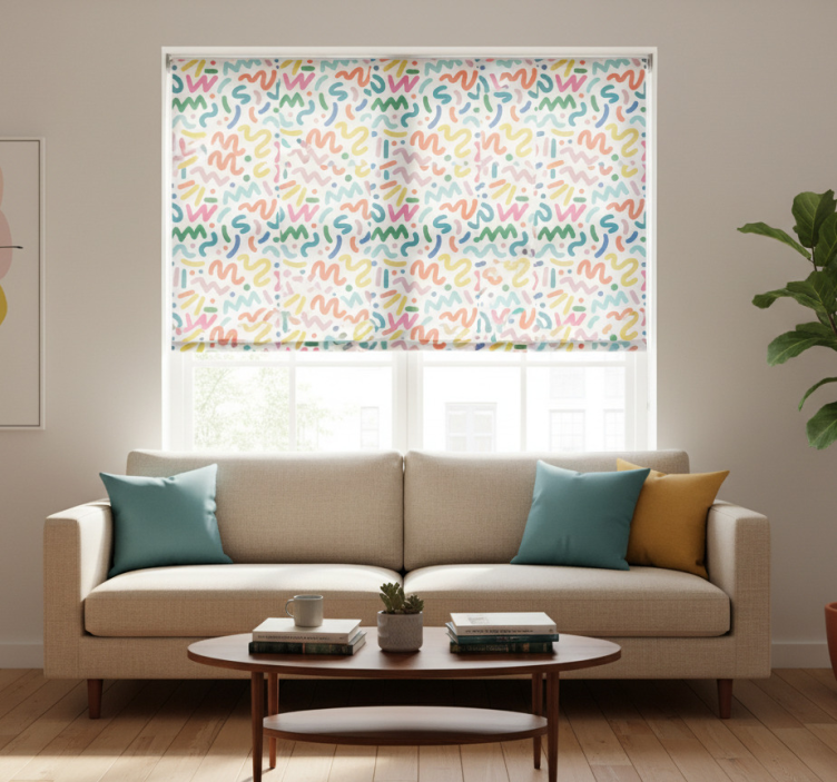 Reference: E7631Transform your living space with our Modern roller blind in abstract color shapes, a stunning addition that combines artistic flair and functionality. This roller blind features a captivating design of abstract color shapes that seamlessly blend modern aesthetics with practicality. The easy assembly in just 2 clicks and effortless cleaning make it a convenient choice for any home. Not only does it protect your room from direct sunlight, but it also provides privacy when lowered, allowing you to enjoy your space without compromise!