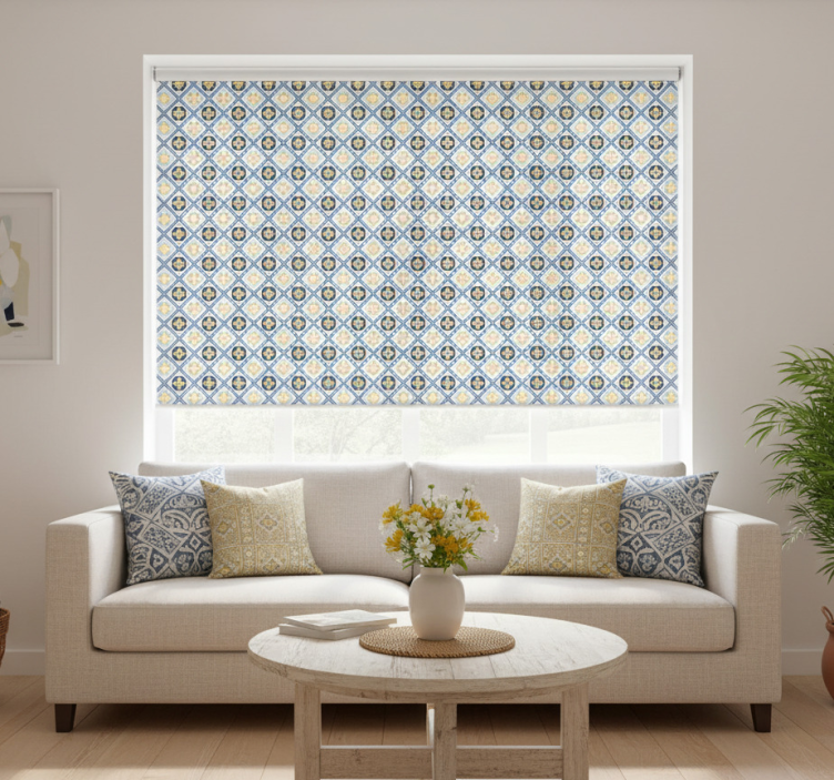 Reference: E7761Introducing our modern roller blind in baby blue and yellow tile, a perfect blend of style and functionality! This stunning design features an intricate tile pattern in soft baby blue and vibrant yellow, adding a touch of elegance to any room. With easy assembly in just two clicks, this roller blind is not only a feast for the eyes but also incredibly practical!