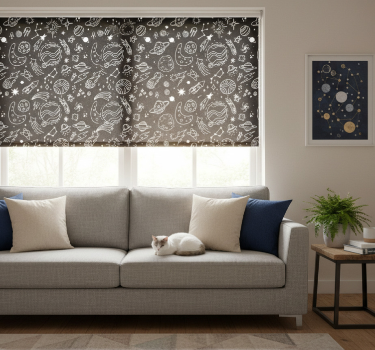 Reference: E7748Introducing our Modern roller blind with cosmic black and white art, a stunning addition to any space! This unique design features a mesmerizing blend of cosmic patterns in a chic black and white color scheme, effortlessly enhancing your home’s aesthetic. With easy assembly in just two clicks, the roller blind is easy to clean and disassemble, ensuring that your windows and surroundings remain pristine. It effectively protects your room from direct sunlight while providing privacy when lowered, helping to regulate room temperature and enhance security by allowing you to see outside without being seen.