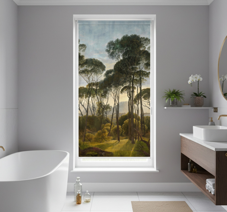 Reference: E6110Transform your space with our Muted tropical palms tree roller blind, a stunning addition that beautifully blends functionality and style. The design features lush, muted tropical palm leaves that evoke a serene paradise, bringing a touch of nature indoors. This roller blind is easy to clean, offers privacy when lowered, and effectively protects your room from direct sunlight, all while enhancing your room's decor!