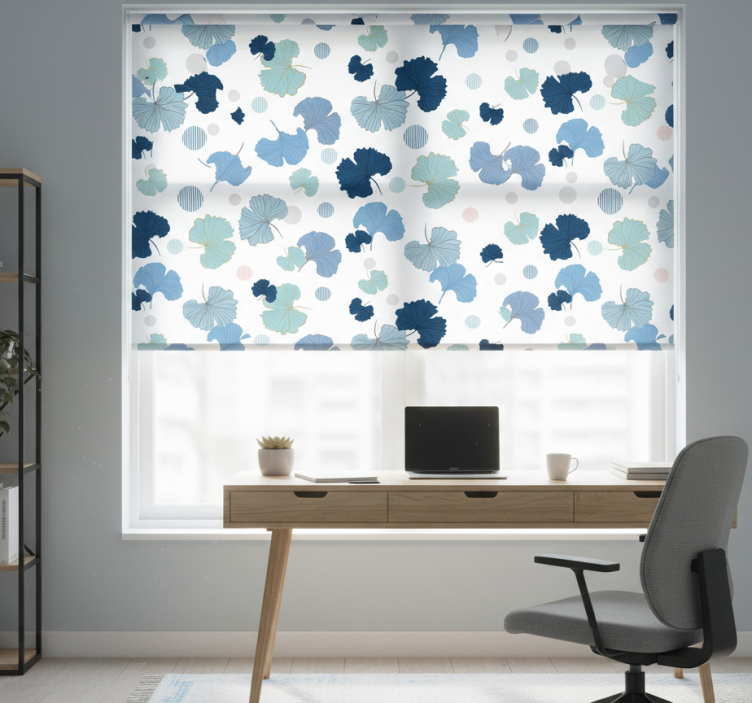 Office roller blind in blue ginkgo leaf design