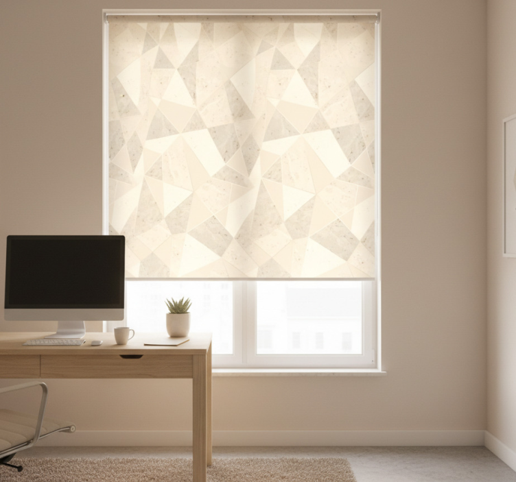 Reference: E7317Introducing our stunning Office roller blind with 3D golden triangles, a captivating blend of modern design and functionality! This eye-catching roller blind features a geometric pattern of golden triangles that brings a touch of elegance to any workspace. Its rich textures and vibrant colors will transform your office into a chic, inspiring environment, all while providing practical benefits. With easy assembly in just two clicks and effortless cleaning, this roller blind is the perfect addition to enhance your decor.