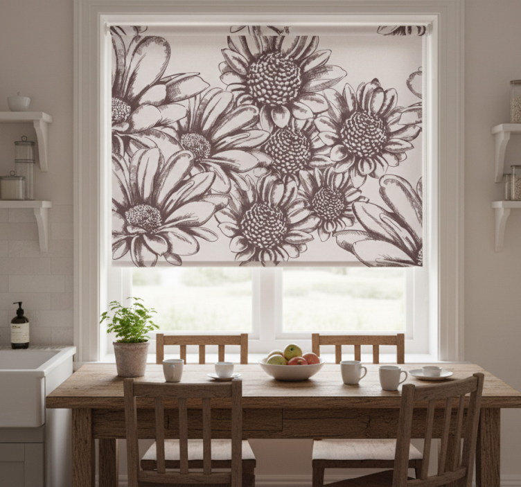 Reference: E8367Transform your kitchen with our stunning Old sunflowers kitchen roller blind, showcasing a vibrant design of golden sunflowers that dance across a soft, neutral background. This charming roller blind not only enhances your space with its artistic flair but also brings a sense of warmth and cheer to your home. The bright sunflowers symbolize happiness and positivity, making it the perfect addition to any kitchen decor.