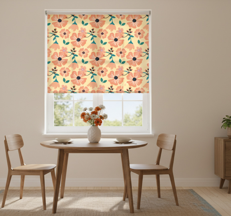 Reference: E6671Transform your living space with the stunning Orange runflowers dining room roller blind. This exquisite design features vibrant orange runflowers that beautifully blend with a soft background, creating a cheerful ambiance while effortlessly enhancing your dining room decor. With its easy assembly in just two clicks, straightforward cleaning, and the ability to regulate light and privacy, this roller blind is not only a stylish choice but also a practical one!