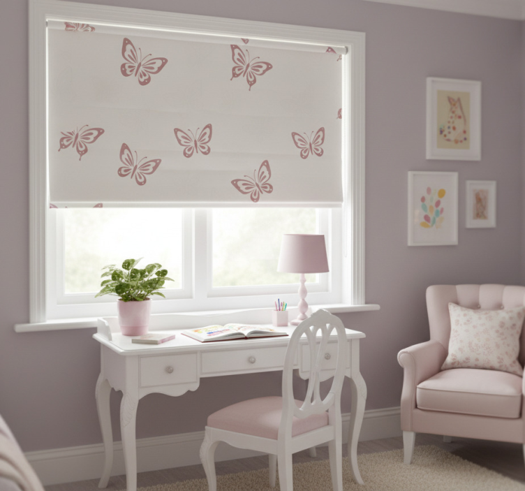 Reference: E8194Transform your space with the enchanting Pink roller blind whimsical flutter butterfly design! This delightful roller blind features fluttering butterflies against a soft pink backdrop, creating a whimsical atmosphere that brightens any room. Perfect for children’s spaces or adding a touch of charm to any décor, this blind is not only visually appealing but also functional, ensuring privacy and light control.