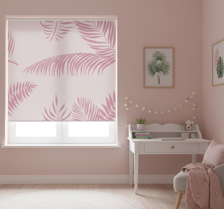 Pink roller blind with large palm leaves
