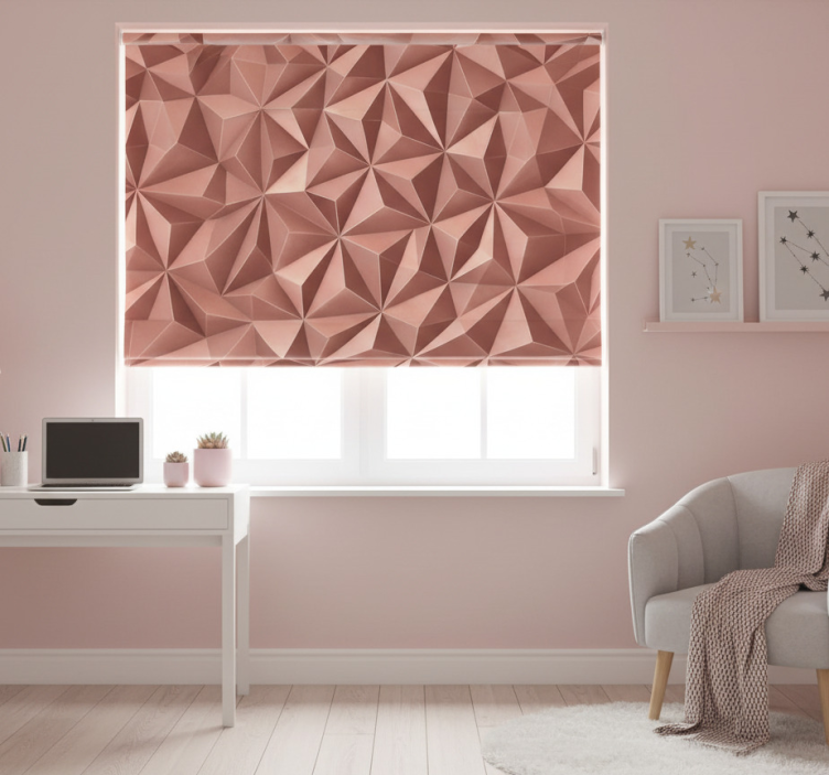 Reference: E8192Introducing our stunning Pink roller blind with rose gold geometric foil, a perfect blend of style and functionality! This exquisite design features a delicate pink background adorned with elegant rose gold geometric patterns, creating a modern and sophisticated aesthetic. Ideal for any room, this roller blind not only enhances the visual appeal but also serves practical purposes.