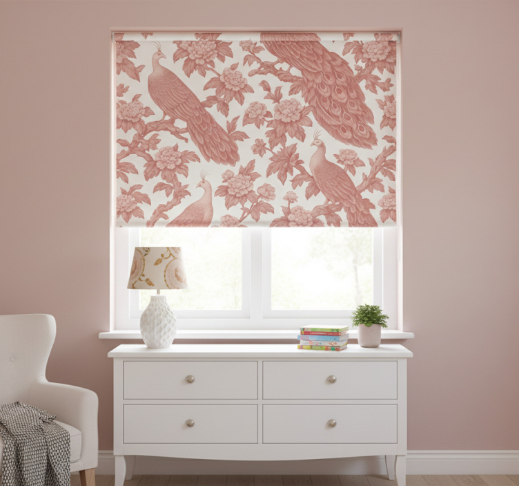Pink roller blind with textile pink peacocks pattern