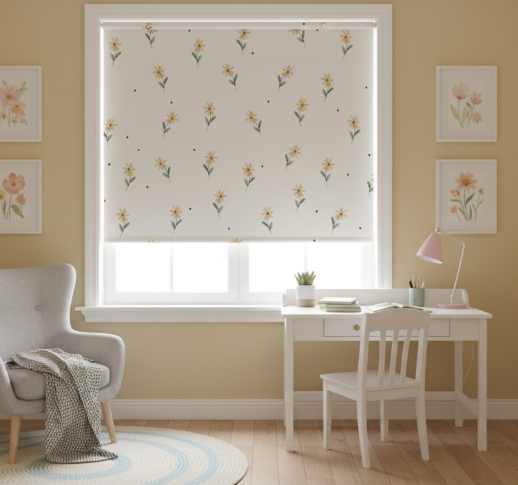 Reference: E8160Introducing our stunning Pink roller blind yellow daisies design, a perfect blend of elegance and cheer for your home! This beautiful roller blind features a delightful pattern of bright yellow daisies set against a soft pink background, bringing a touch of warmth and joy to any room. Its eye-catching design not only enhances your interior decor but also creates a cozy atmosphere, making it an ideal choice for living rooms, bedrooms, or play areas. With easy assembly in just two clicks, simple cleaning, and disassembly, this roller blind is as practical as it is pretty!