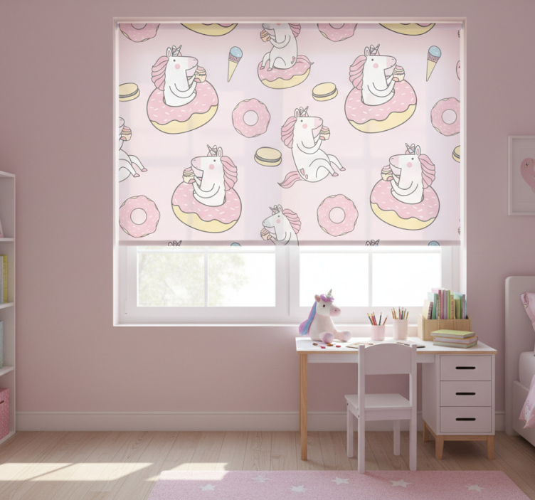 Reference: E7212Transform your child's space into a magical haven with our Pink unicorn children room roller blind. This delightful roller blind features an enchanting design that showcases whimsical pink unicorns prancing across a dreamy landscape. The vibrant colors and intricate details create a playful atmosphere, making it the perfect addition to any children's room. With its easy assembly in 2 clicks and easy disassembly, maintaining this stunning decor piece is a breeze. It also protects the room from direct sunlight while providing privacy when lowered, ensuring your child's sanctuary is both beautiful and functional!