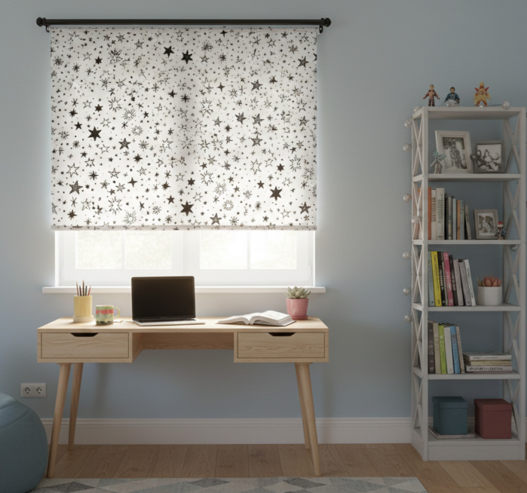 The Teenage bedroom roller blind black star pattern on white teenage bedroom roller blind is the perfect addition to elevate your room's decor! This stylish roller blind brings a sense of fun and personality, making it a must-have for any teenage space. The unique star pattern adds a touch of whimsy while ensuring privacy and light control, inspiring creativity and a cozy atmosphere. Let your room reflect your vibrant personality!