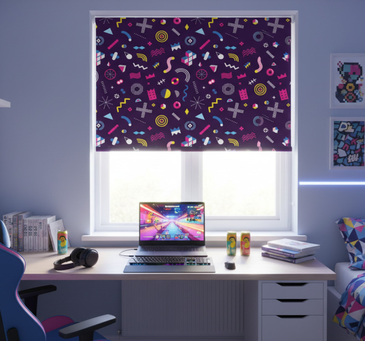 The Teenage bedroom roller blind memphis gaming design teenage bedroom roller blind is the perfect way to express your personality and love for gaming while enhancing your room's decor. Imagine waking up to a burst of creativity each day as this eye-catching design transforms your space into a vibrant sanctuary. Not only does it improve the overall aesthetic of your bedroom, but it also helps regulate room temperature and provides a sense of security. With its customizable measurements and various textures, it fits seamlessly into any room, making it a truly inspiring choice!