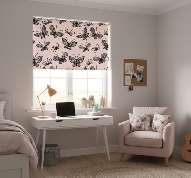The Teenage bedroom roller blind with black butterfly pattern teenage bedroom roller blind is an ideal choice for adding a splash of personality to your decor! Its unique design captivates attention and encourages creativity, making it perfect for any teen's room. Not only does it improve the overall look of the space, but it also provides functionality by protecting against direct sunlight and allowing you to regulate the room temperature. Elevate your decor and make a bold statement with this beautiful roller blind!