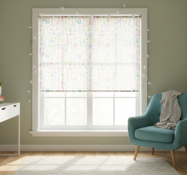 Reference: E7411Transform your space with our Teenage bedroom roller blind with key pattern motif, designed to add a playful touch to any teenage room! Featuring a vibrant key pattern, this roller blind not only enhances the aesthetic appeal but also serves practical purposes. Its easy assembly in just 2 clicks and easy disassembly allow for quick cleaning of both the blind and its surroundings. Additionally, it effectively protects the room from direct sunlight, provides privacy when lowered, and helps regulate the room temperature. With 100% customizable measurements available, you can select from three different textures depending on your light and privacy preferences. The included chain mechanism makes raising and lowering the blind a breeze!