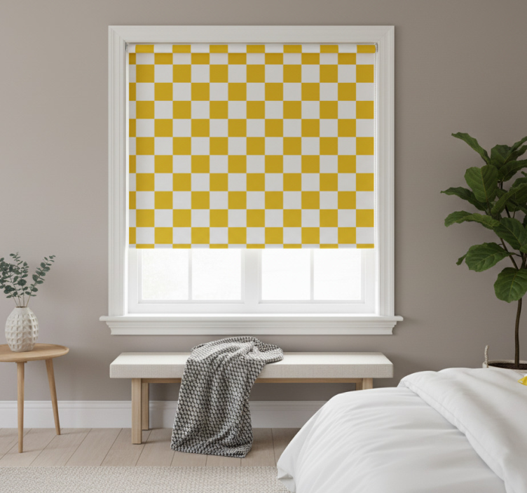 Reference: E8741Introducing our stunning Yellow roller blind with checkered pattern, designed to bring a vibrant touch to any room! This eye-catching product features a delightful checkered design that adds a playful yet elegant flair. With its easy assembly and disassembly, you can effortlessly clean your windows and surroundings. Not only does it protect your space from direct sunlight, but it also ensures your privacy when lowered, allowing you to enjoy your personal sanctuary. Additionally, it helps regulate room temperature and enhances the overall security of your home by allowing you to see outside without being seen.