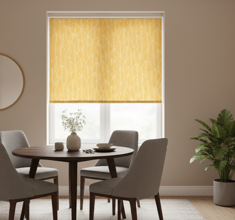 Reference: E8227Transform your space with our stunning Yellow roller blind with foliage yellow pattern, featuring a vibrant yellow background adorned with a delicate foliage design. This enchanting roller blind not only enhances the aesthetic appeal of your interiors but also serves practical purposes. With easy assembly in just two clicks, it is easy to clean and allows for quick disassembly, making window maintenance a breeze. It effectively protects your room from direct sunlight, provides privacy when lowered, and helps regulate room temperature while ensuring security by allowing you to see outside without being seen.
