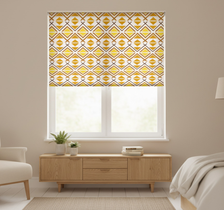 Reference: E8761Introducing our stunning yellow roller blind with geometric pattern design, a perfect fusion of style and functionality! This eye-catching piece features a vibrant yellow hue adorned with a modern geometric pattern that adds a touch of sophistication to any room. The design not only enhances the aesthetics but also provides essential benefits such as easy assembly in 2 clicks, effortless cleaning, and the ability to regulate room temperature effectively!