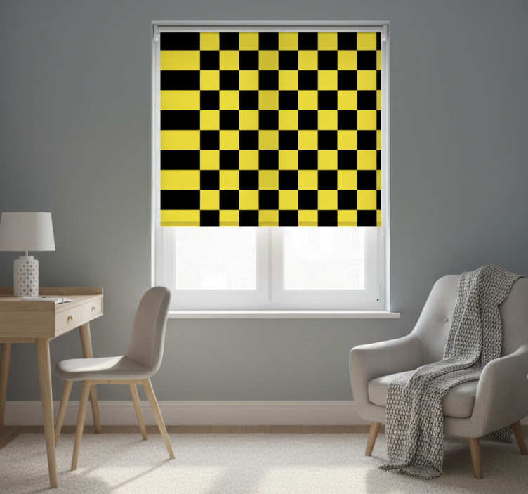 Reference: E8749Introducing our stunning Yellow roller blind with yellow and black checkerboard, a perfect blend of style and functionality! This unique design features a vibrant yellow backdrop adorned with a striking black checkerboard pattern, creating a lively atmosphere in any room. Ideal for adding a splash of color, this roller blind not only enhances your decor but also provides essential privacy and light control.