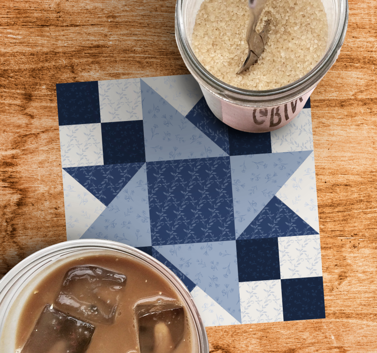 Introducing our stunning Coasters with elegant floral star pattern that effortlessly combine beauty and functionality! Featuring a captivating design, these coasters showcase a charming star pattern adorned with floral elements, all beautifully intertwined in a textured patchwork of blue geometric shapes. Perfect for adding a touch of sophistication to any table setting, they are a delightful blend of art and utility!
