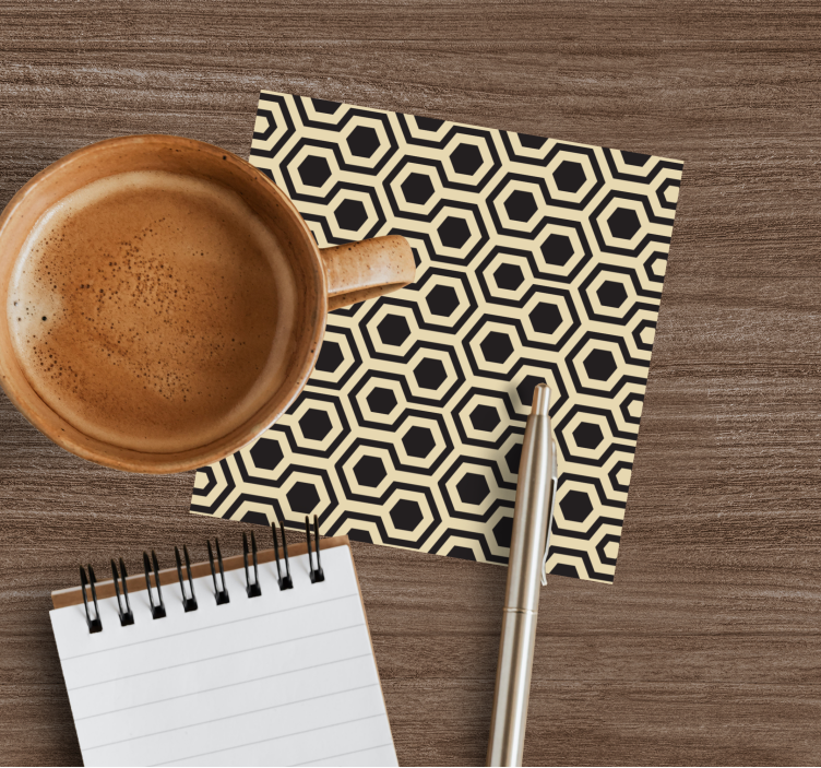 Introducing our stunning Honeycomb pattern design coasters, where modern aesthetics meet geometric charm! The design showcases a captivating array of hexagons in a stylish black and beige palette, creating a repeating pattern that adds a unique flair to any tabletop. These geometrical coasters are not just visually appealing; they bring a sense of sophistication and elegance to your home, perfect for both casual gatherings and formal occasions.