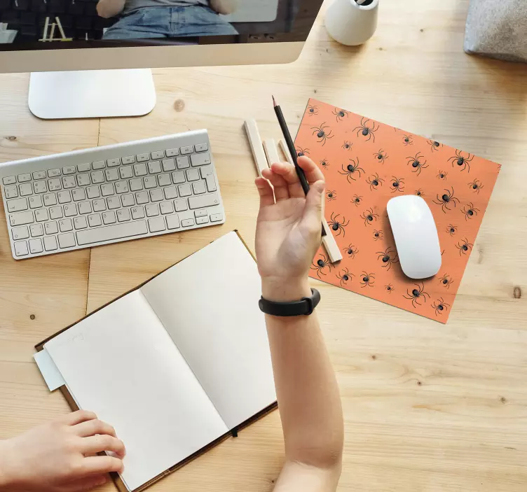 Reference: N3379An engaging surface featuring a spider pattern in orange and black. The design incorporates multiple spider icons scattered throughout, creating a playful yet spooky aesthetic, perfect for gaming enthusiasts or themed events.