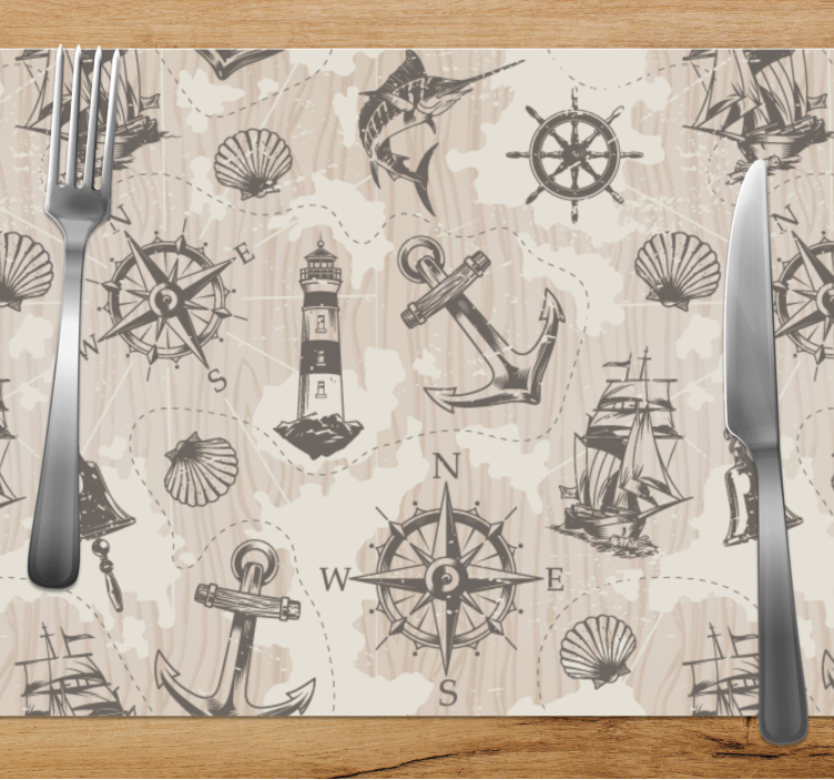 This decorative placemat is the perfect addition to any seafood place, adding a touch of pirate treasure map aesthetic and marine elements. The design features anchors, swordfish, shellfish, compass, lighthouses, steerwheel, and ships in a gray ancient appearance.