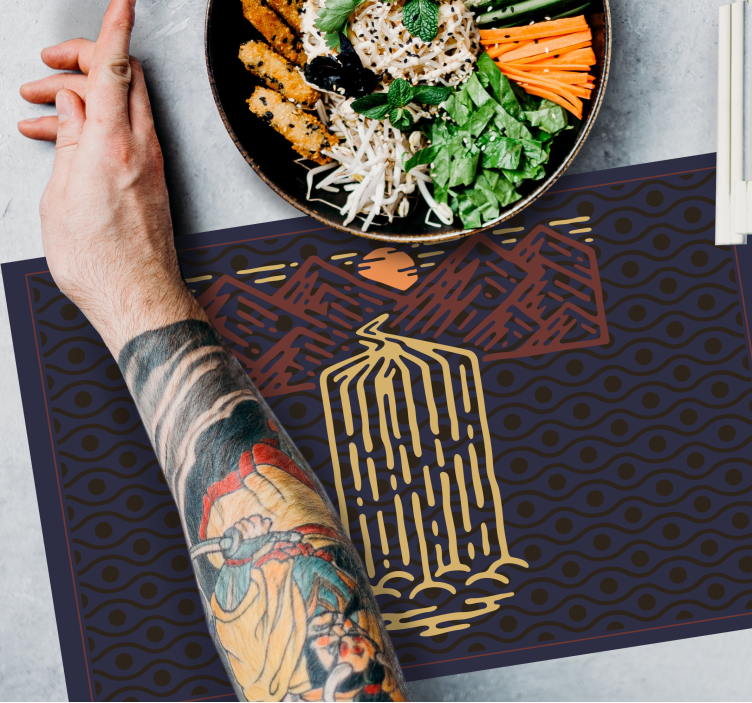 Experience the beauty of nature with our Original placemats mountain waterfall scene. This stunning design features an artistic drawing of a majestic waterfall cascading through abstract mountains, capturing the essence of African landscapes. The blend of vibrant colors and intricate details creates a captivating visual that brings the tranquility of nature right to your dining table!