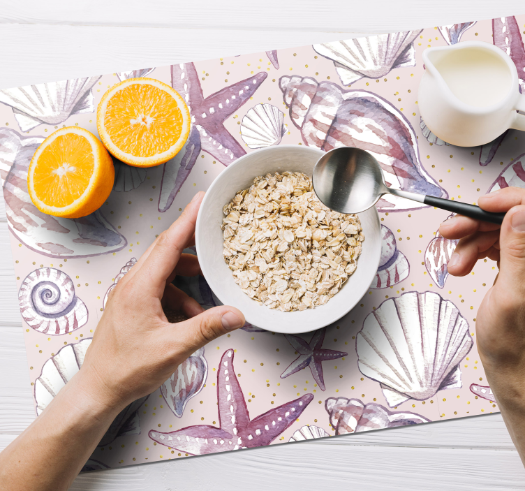 Elevate your dining space with the Shell print motif placemat, an ideal choice for decoration. This placemat not only protects your surfaces but also adds a touch of coastal charm to any setting. Imagine hosting friends and family, with each meal accompanied by the serene beauty of seashells and starfish. Its gentle colors bring warmth and a relaxed vibe, making every gathering feel special!