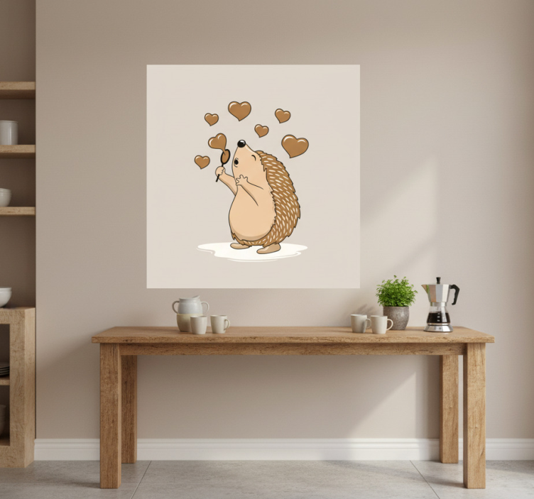 Reference: G601The Kitchen poster hedgehog with love hearts is a delightful blend of charm and artistic flair! This enchanting design features a whimsical hedgehog surrounded by vibrant love hearts, creating a heartwarming atmosphere that brightens any kitchen space. Crafted on a sturdy 180g/m2 material, this poster boasts a semi-matt finish that minimizes reflections while showcasing high colour intensity, making it a standout piece in your home decor.