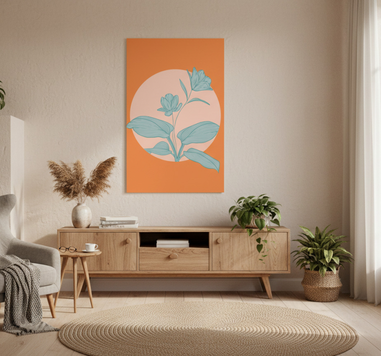 Every corner of your home deserves a touch of inspiration, and the Living room poster blue flowers on orange shapes living room poster does just that! This exquisite piece not only enhances your living space but also sparks conversation and uplifts your mood. Imagine walking into a room filled with warmth and creativity; this poster is designed to do just that, adding a splash of color and charm to your decor!