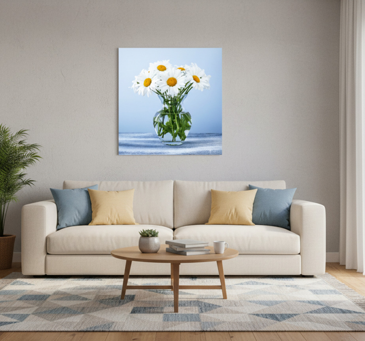 Reference: G803Introducing our stunning Living room poster daisy flowers in glass pots, a beautiful addition to elevate your home decor. This design features vibrant daisies blooming in elegant glass pots, capturing the essence of nature in a striking visual representation. With a 180g/m2 grammage that makes it perfect for posters, a semi-matt finish that avoids reflections, and high colour intensity, this artwork is sure to brighten any living space!