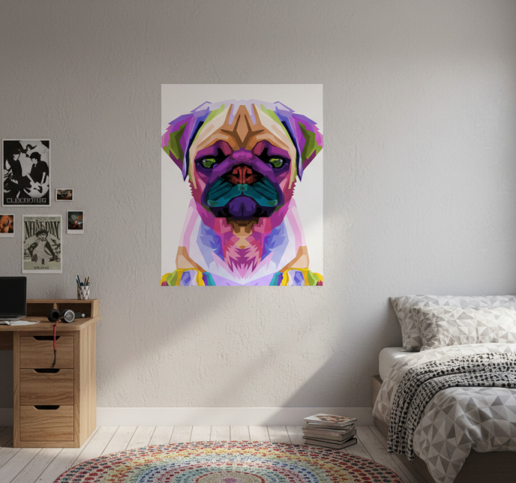 Reference: G765The Living room poster pop art pug is a vibrant and lively piece that brings a playful touch to any space. This poster showcases a striking pug design, bursting with high colour intensity and a semi-matt finish that eliminates reflections, ensuring a clear and captivating view from any angle. With a grammage of 180g/m2, this poster is crafted specifically for durability, making it an ideal choice for your home decor.
