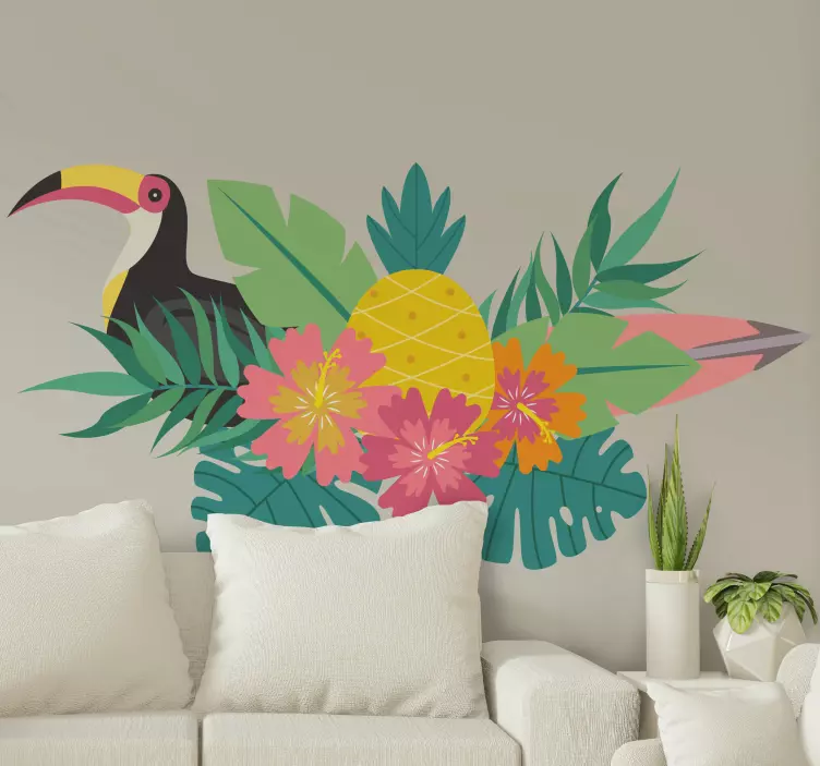 Transform your walls into a vibrant tropical paradise with our Animal wall sticker tropical bird design. This stunning design features a colorful toucan surrounded by lush greenery, pineapple motifs, and a variety of beautiful flowers. The lively leaves and vibrant colors of this sticker will bring a cheerful ambiance to any space, making it perfect for nature lovers and those looking to add a touch of artistry to their home decor.