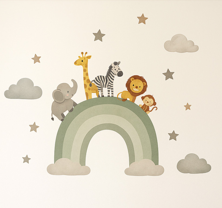 Reference: A54150Transform any child's room into a magical space with our Childrens' wall stickers animal cool rainbow adventures. Featuring whimsical designs of playful animals, vibrant rainbows, and adventurous scenes, these wall stickers inspire creativity and joy. Each sticker is meticulously crafted to ensure bright colors and a delightful aesthetic that will captivate children's imaginations.