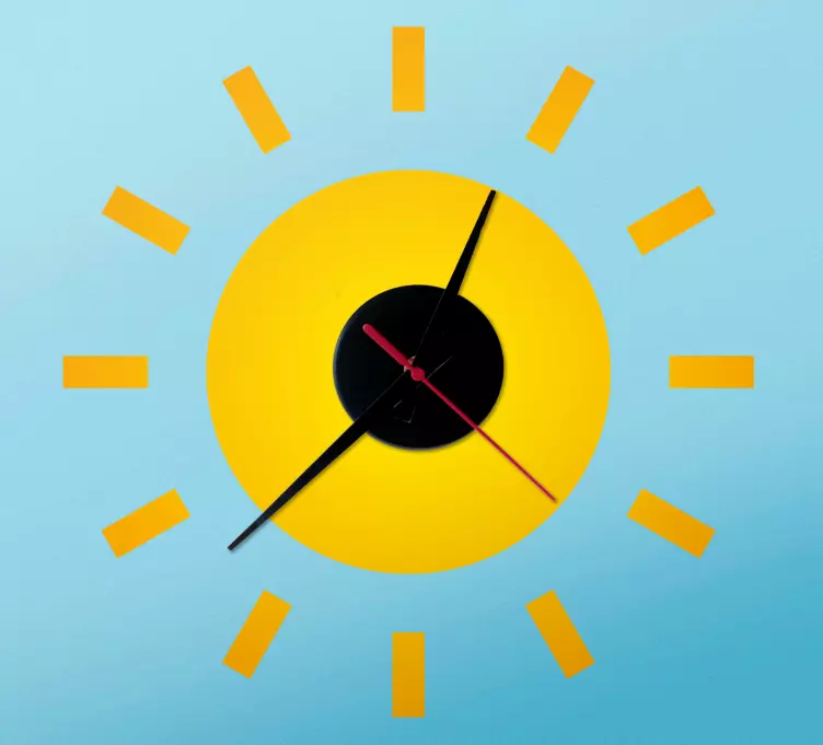 Reference: A49340A vibrant depiction of a sun-inspired timepiece featuring a bright yellow circle surrounded by elongated rays. The design merges functionality with a playful aesthetic, making it a striking addition to any space. It showcases the beauty of time in a sunny, cheerful manner.