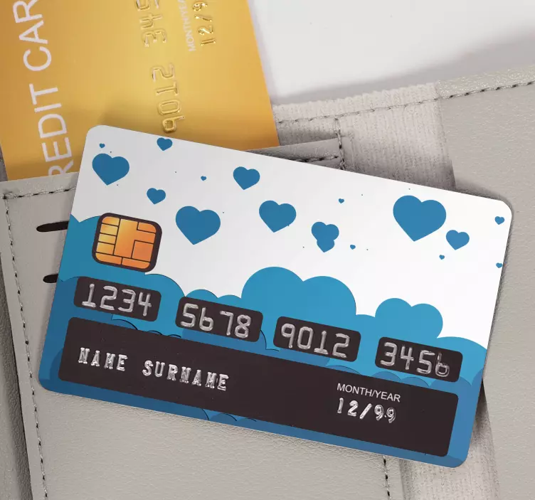Introducing our Credit card sticker cloud hearts design! This delightful sticker features playful hearts floating amidst fluffy clouds in a soothing blue hue. It's perfect for those who want to add a touch of love and charm to their credit cards, transforming them into a reflection of their personality!