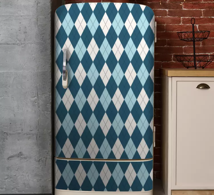 Transform your kitchen with our Fridge sticker diamond pattern wrap, showcasing a stunning design of elegantly arranged rhombuses and diamonds in a captivating blue hue. This geometric pattern adds a touch of modern sophistication to your fridge, effortlessly enhancing your home decor while making a bold statement!