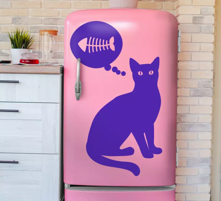 Introducing the Fridge sticker thoughtful cat silhouette, a delightful design that captures a cat in a thinking pose, complete with a humorous thought bubble featuring a fishbone. This charming silhouette brings a touch of whimsy to your kitchen, making your space feel more inviting and fun! Perfect for pet lovers, this fridge sticker adds personality to your kitchen decor while evoking smiles every time you open the fridge!