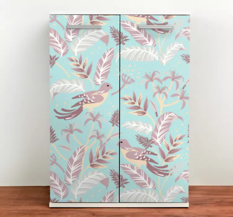 Transform your living space with our Furniture sticker botanical bird design, featuring a stunning array of birds and parrots amidst a lush backdrop of leaves and exotic flora. The tropical vibe of this design radiates with pastel colors, seamlessly blending flora and fauna into a captivating pattern that brings nature indoors. This decorative piece is perfect for enhancing furniture, evoking a sense of serenity and beauty in any room!