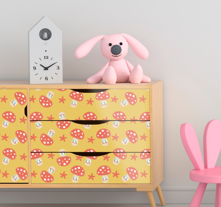 Transform your space with our enchanting Furniture sticker mushroom pattern design. This whimsical creation features delightful mushrooms, including the iconic fly agaric, playful stars, and a vibrant yellow background, making it an ideal choice for children's decor. Its charming aesthetic is sure to spark imagination and joy in any room!