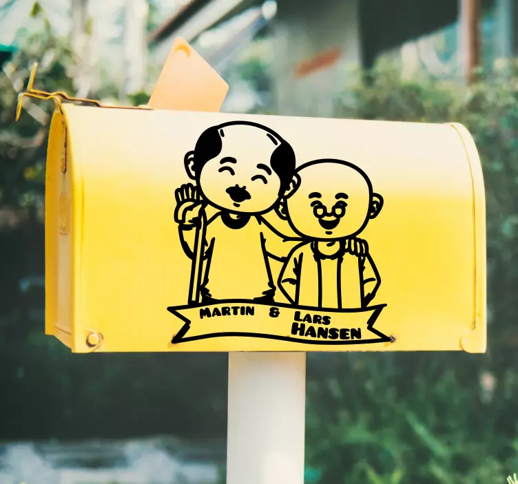 Transform your space with our Home wall sticker cheerful character duo, featuring delightful and friendly characters that radiate love and whimsy! This charming design includes a mailbox and two men that bring a personal touch to your home decor. With the ability to be personalized and customized, this sticker is perfect for adding a cheerful vibe to any room!