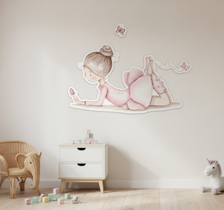 Reference: A54314Introducing our stunning Illustration sticker ballerina with butterflies! This delightful design features a graceful ballerina surrounded by whimsical butterflies, beautifully capturing the essence of dance and freedom. The vibrant colors and intricate details create a captivating visual experience, making this sticker a perfect addition to your home decor.