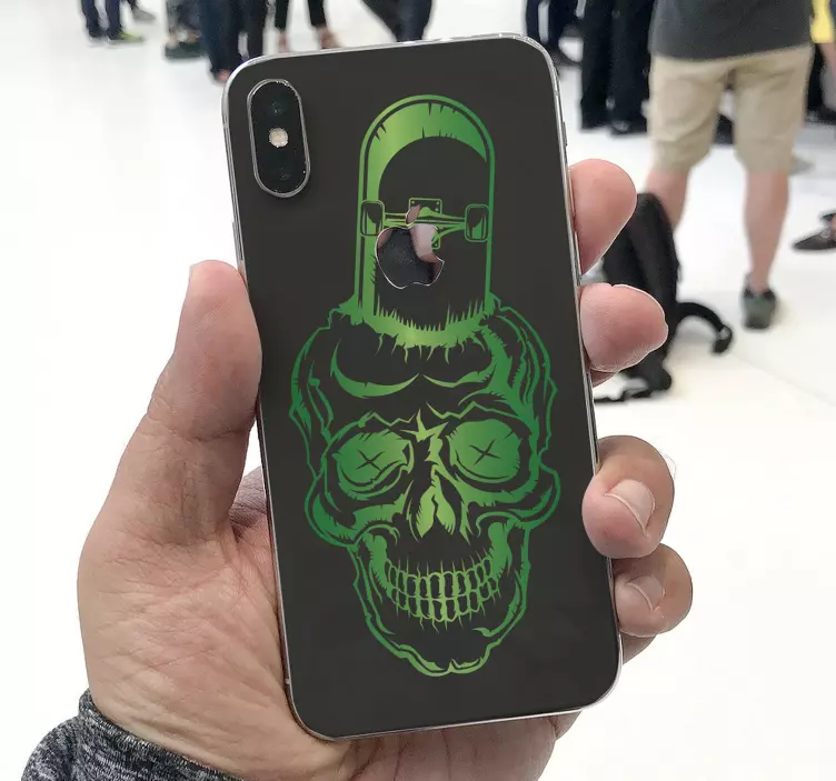 Introducing the iPhone sticker green skull design, a captivating blend of vibrant green hues and edgy graphics that features a striking skull character. This unique design brings together elements like a phone, skateboard, and a rebellious spirit, making it perfect for anyone looking to add a touch of personality to their device!