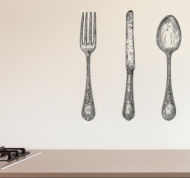 Reference: A54290Transform your kitchen with our stunning Kitchen wall sticker grey cutlery design! This artistic piece features a captivating grey cutlery motif that seamlessly blends elegance with functionality. The design showcases an array of beautifully crafted cutlery, making it a delightful focal point for any culinary space. Its satin finish ensures a vibrant color intensity without any glare, allowing the intricate details of the cutlery to shine through, perfect for enhancing your kitchen's ambiance!