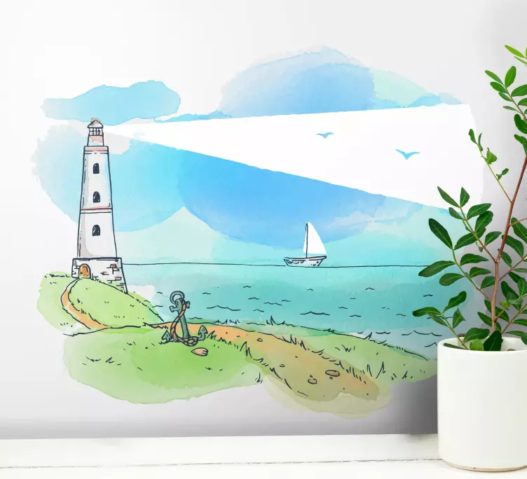 Transform your space with our Location sticker coastal lighthouse view, a stunning design that beautifully captures the essence of a lighthouse by the sea. This breathtaking illustration features a serene ocean landscape, complete with gentle waves, a picturesque sailing scene, and a charming pathway leading to the coastline. Embrace the beauty of nature with this exquisite piece that brings the seaside right into your home!