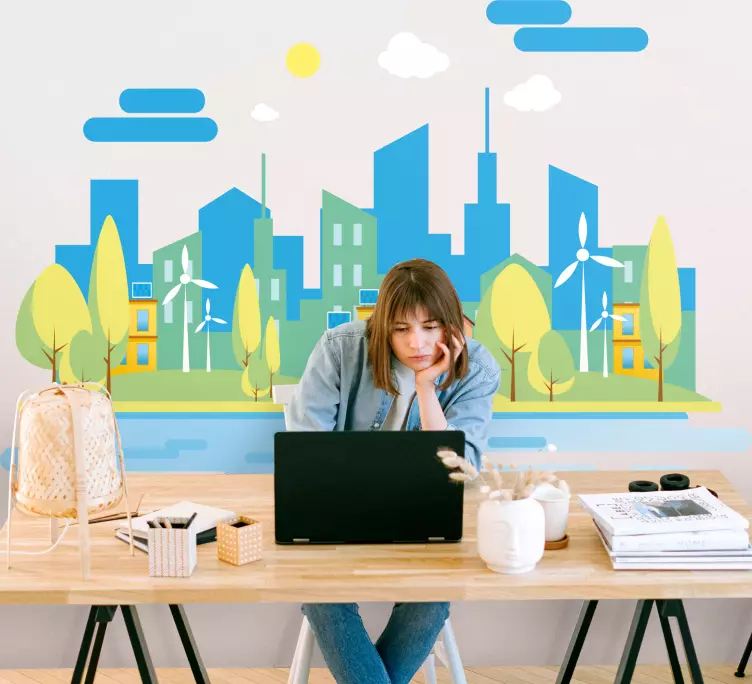 Transform your space with our stunning Location sticker modern urban landscape. This captivating design features a vibrant cityscape silhouette, complete with towering skyscrapers, lush trees, serene water bodies, and innovative wind turbines, all under the warmth of a shining sun. The illustration brings to life the essence of urban living, combining the beauty of buildings and nature in perfect harmony.