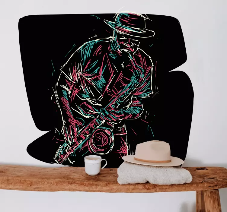 Transform your space with the Music wall sticker saxophonist in action, a stunning abstract design that captures the essence of jazz. This unique drawing portrays a jazzman passionately playing the saxophone while wearing a stylish hat. The vibrant colors and dynamic lines convey the energy of a live performance, making it a perfect addition for music lovers and artists alike!