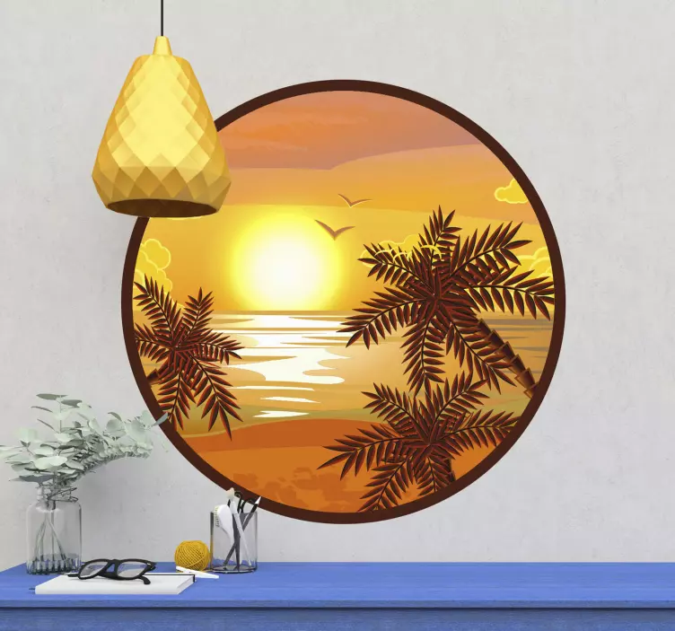 Transform your space with our stunning Nature wall sticker serene sunset view. This captivating design features a circular layout adorned with palm trees swaying gently against a backdrop of a vibrant beach and ocean, all illuminated by a serene sunset. It effortlessly brings the tranquility of nature indoors, inviting a tropical ambiance that soothes the soul.