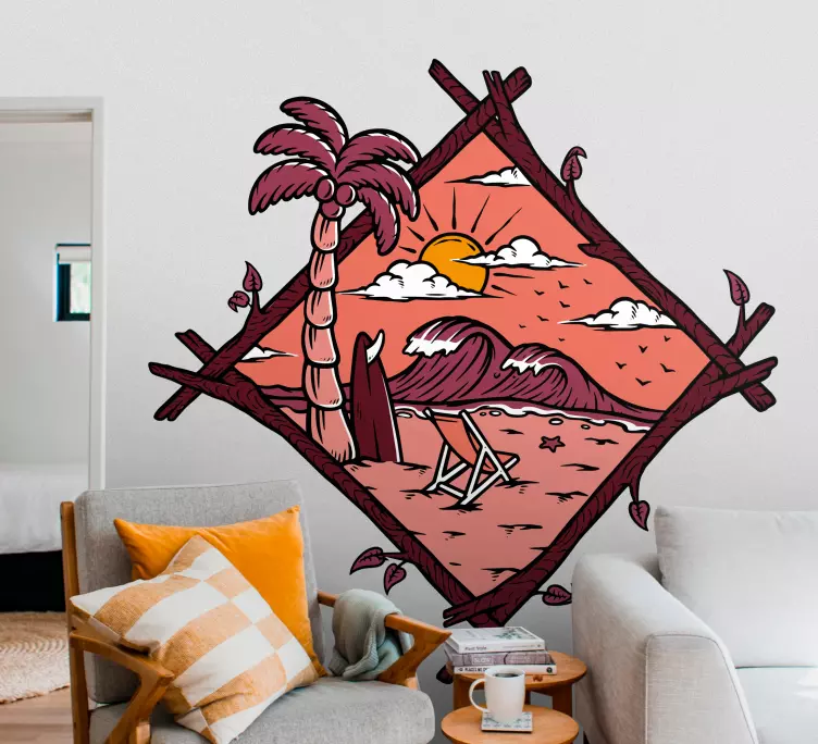 Transform your space with our Nature wall sticker tropical beach scene, where a lonely surfer rides the waves at sunset, surrounded by palm trees and the serene beauty of mountains. This captivating drawing captures the essence of relaxation, inviting you to unwind in your very own tropical paradise. Picture yourself lounging in a beach chair, soaking in the vibrant colors of the sky as the sun dips below the horizon.