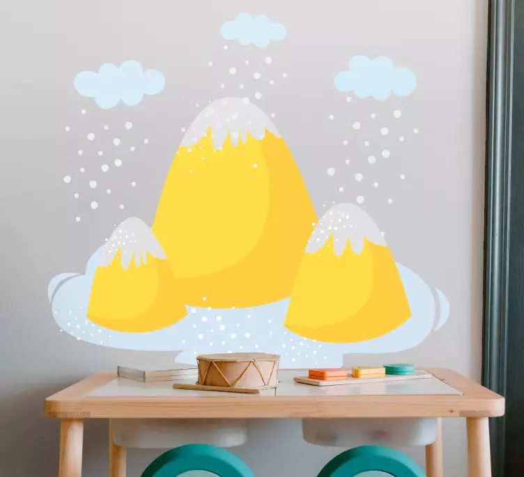 Transform your space with our stunning Nature wall sticker yellow mountain peaks, featuring a whimsical illustration of majestic yellow mountain peaks rising above fluffy clouds, all adorned with a touch of snow. This captivating design brings the beauty of nature indoors, creating a serene atmosphere that inspires and uplifts.